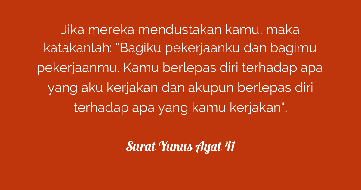 This is qs 10:41 english translate. Kamu berlepas diri terhadap apa yang aku kerjakan dan akupun berlepas . Kamu tidak bertanggung jawab terhadap apa yang aku kerjakan dan aku pun tidak bertanggung jawab terhadap apa yang kamu kerjakan. setiap . Quran image yunus41 wain kaththabooka faqul lee aaamalee walakum aaamalukum . Jika mereka mendustakan kamu, maka katakanlah: